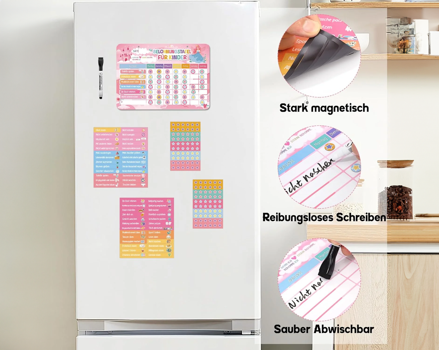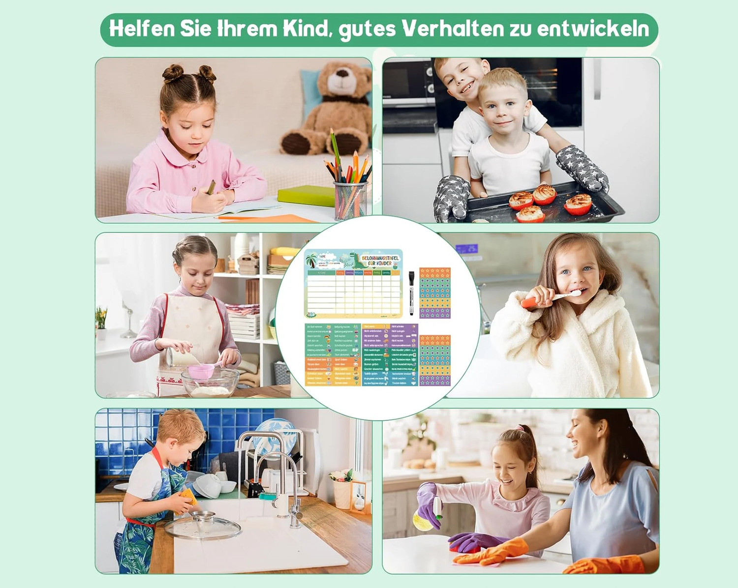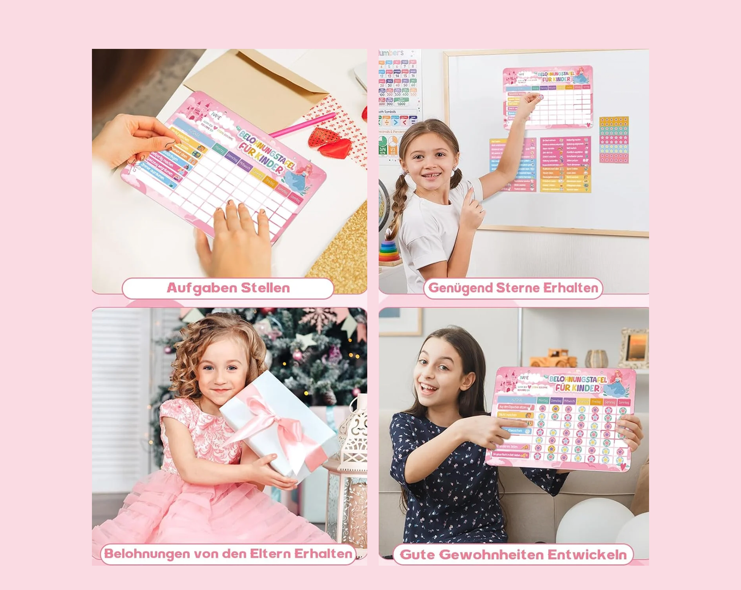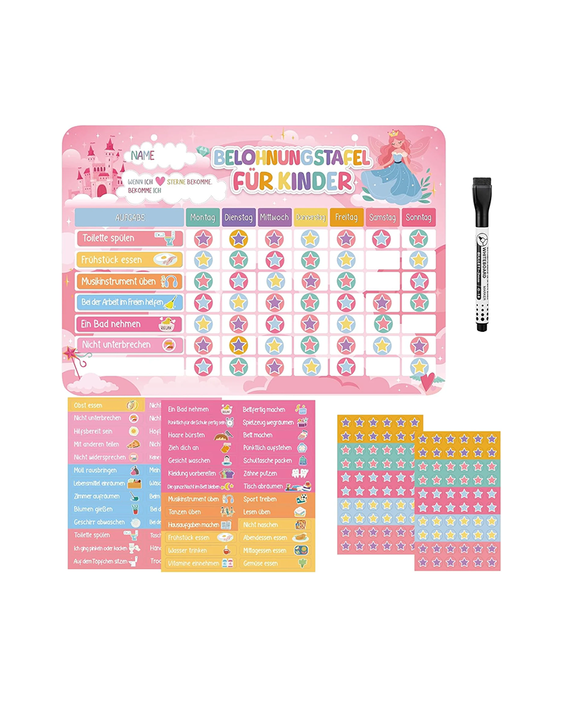 Die Belohnungstafel für Kinder bietet Eltern ein effektives Hilfsmittel, um Kinder auf spielerische Weise für Aufgaben zu motivieren und gutes Benehmen zu fördern. Nie wieder nervige Streitereien über Zähne putzen, Anziehen oder Teller wegräumen.