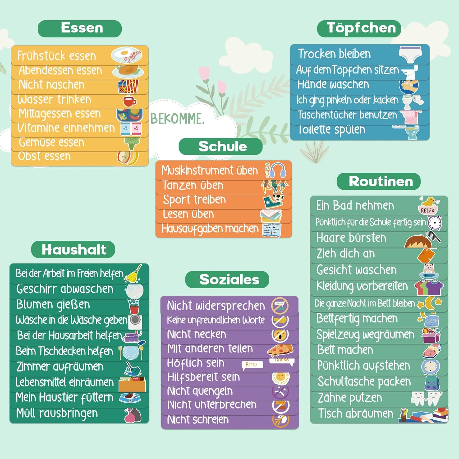 Zähne putzen, Anziehen oder Spielzeug wegräumen? Die Belohnungstafel für Kinder deckt mit ihren 5 Kategorien und 52 bedruckten Aufgaben-Magneten alle erdenklichen Aufgaben und Pflichten für Kinder ab 4 Jahren ab.