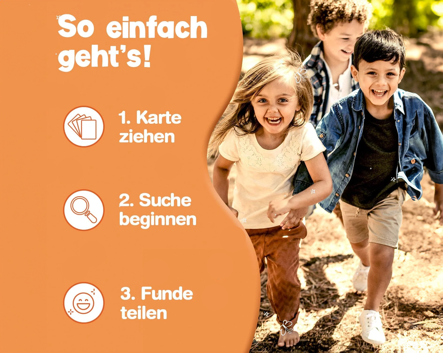 Mit diesem Suchspiel kรถnnen sich Eltern zurรผcklehnen und den Spielkarten die Arbeit รผberlassen. Lass dein Kind eine Karte ziehen und sieh zu, wie der Suchauftrag die Arbeit macht. Es war noch nie so einfach, Kinder fรผr die Natur zu begeistern.